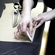 一套凱利易紳正裝,且體師要進行20—30個數(shù)據(jù)的測量,在做的過程中,還要隨時找到身上的細微變化,以確保數(shù)據(jù)準確無誤,并留下相關的影像資料備用.然后工藝師核對相關數(shù)據(jù),用紙板打出紙樣,進行面料的裁剪。